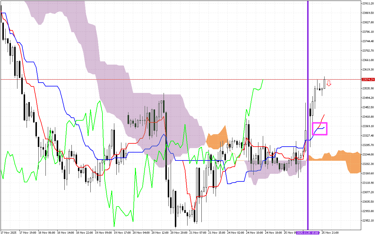 Isignali eyinhloko yamaseshini akamuva okuhweba impambana yolayini Tenkan kanye ne-Kijun, emakwe eshadini ngesikwele esipinki. Lesi isignali engalungile. Kubonisa ushintsho kuthrendi ezayo iye kweya phansi.