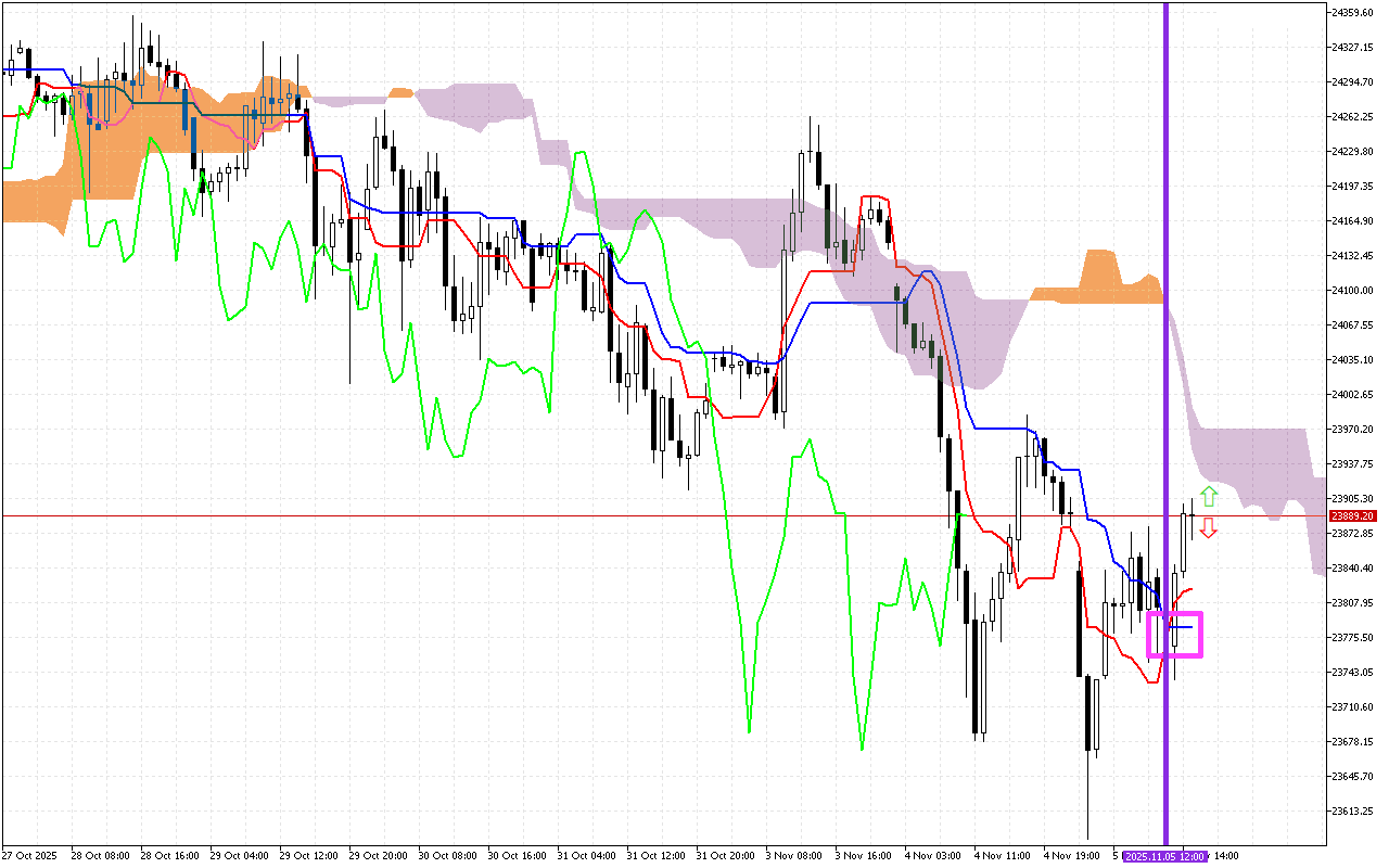 Ukuhlaziya izikhathi zokuhweba zangaphambilini, kufanelekile ukunaka impambana yolayini Tenkan kanye ne-Kijun, emakwe ngesikwele esipinki. Ulayini osheshayo we-Tenkan wehle ngaphansi kolayini we-Kijun, ovame ukuphawula ushintsho lwethrendi ukuya kweyokwehlayo. Nokho, ngokuhamba kwesikhathi intengo yenyuka ngaphezu komugqa we-Tenkan, okubonisa ubuthakathaka bomfutho ophansi.