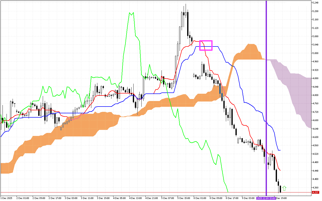 Okwamanje, isignali yemigqa emithathu iyabonwa eshadini elithi Natural Gas. Ngaphakathi kwalesi siginali, imigqa yenkomba ihlelwa ngokulandelana okuphambene. Intengo ingaphansi komugqa obomvu we-Tenkan, ulayini oluhlaza we-Kijun, kanye nefu le-Kumo. Lesi siginali sibonisa ukubusa kwethrendi eyehlayo kanye namathuba aphezulu okuqhubeka kwayo.