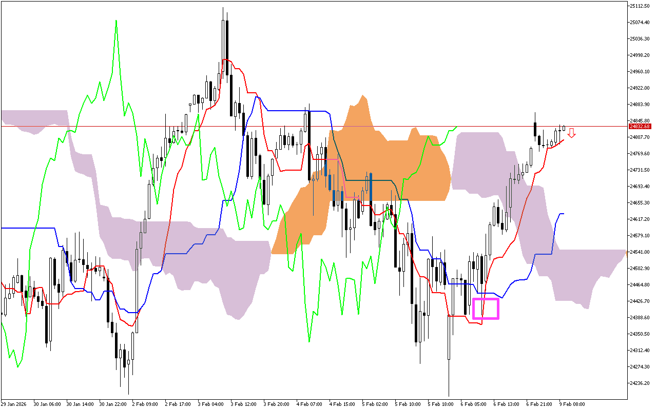 Phakathi namaseshini adlule okuhweba, ukuphambana kwemigqa ye-Tenkan kanye ne-Kijun, emakwe ngesikwele esiphinki, ibonwe eshadini elithi Natural Gas. Lesi siginali sibonisa ushintsho olungase lube khona kuthrendi eyehlayo.