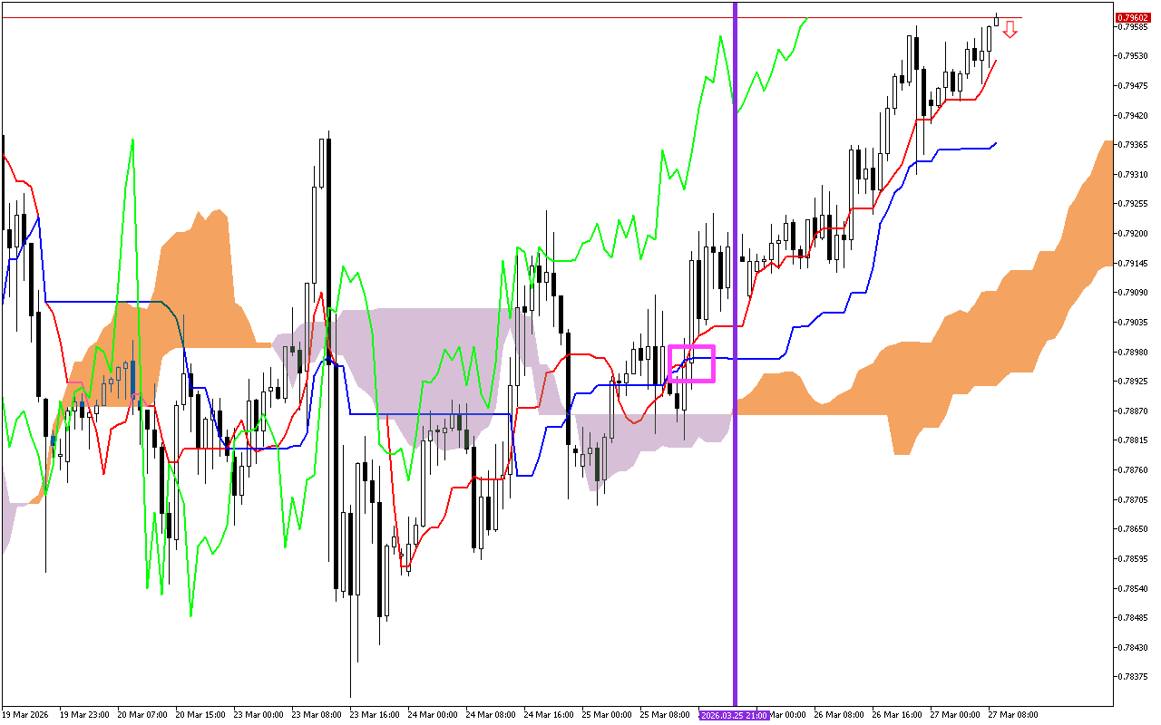 Enye yezimpawu eziyinhloko zezikhathi zokuhweba zangaphambilini kwaba ukuphambana kwemigqa ye-Tenkan kanye ne-Kijun. Le ndawo imakwe ngesikwele esiphinki egrafu. Ukukhuphuka komugqa we-Tenkan ngaphezu komugqa we-Kijun kuyisignali evumayo, engabonisa ushintsho olungenzeka kuthrendi ukuya phezulu.