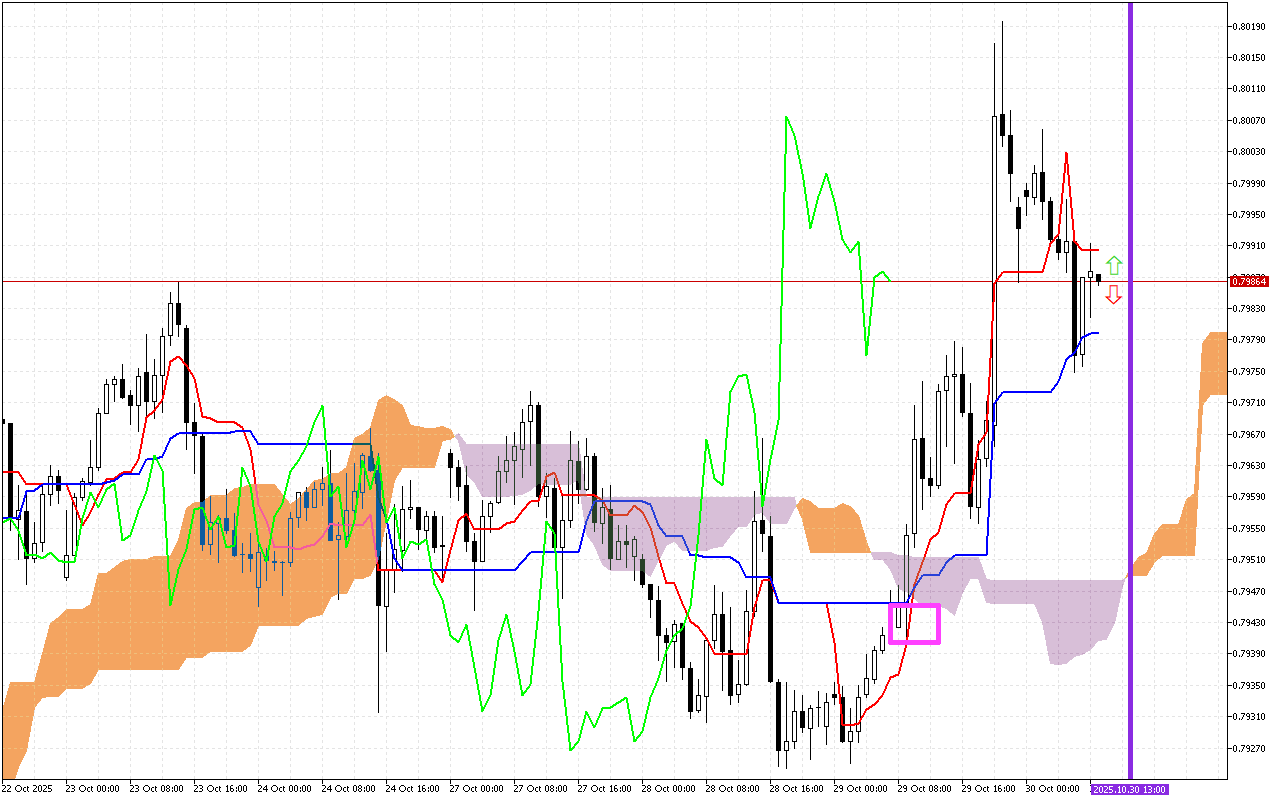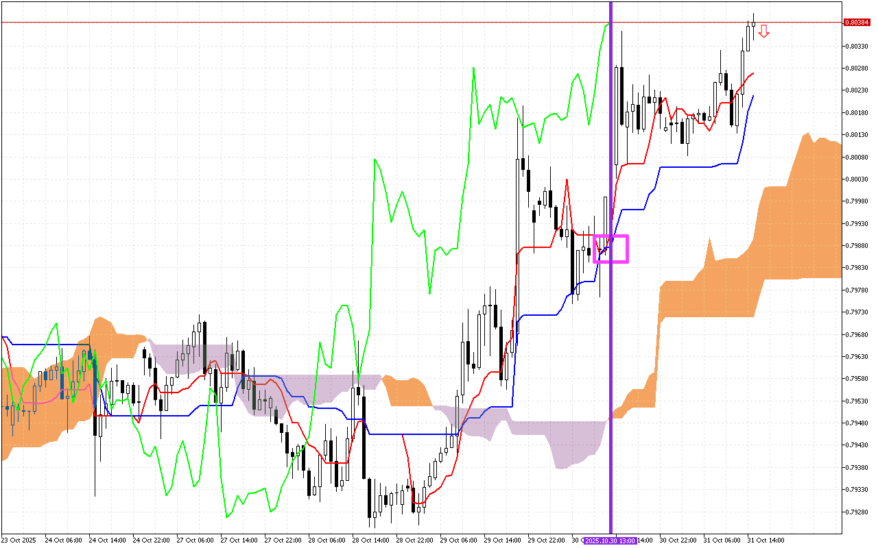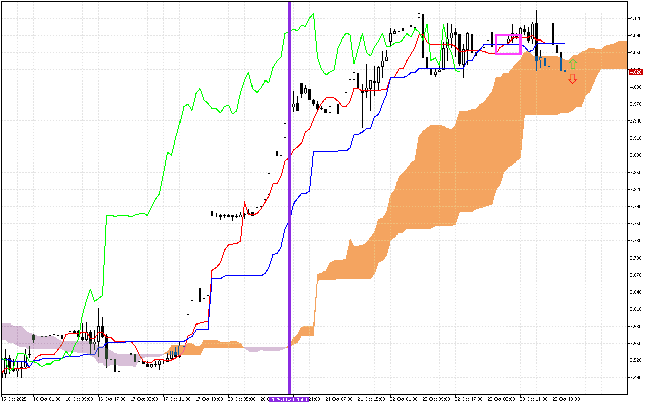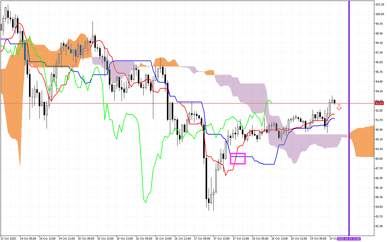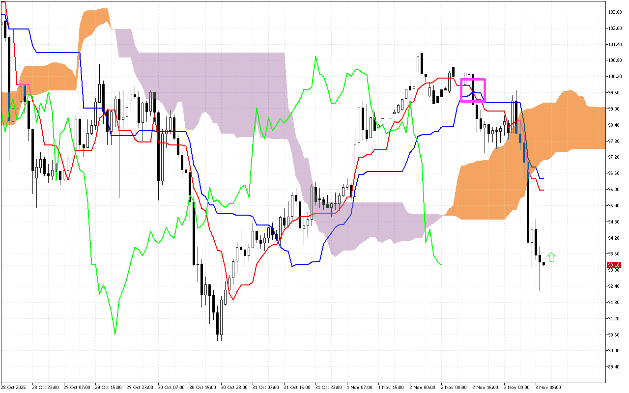 Ulayini we-Tenkan uhlala ungaphezulu kolayini we-Kijun, kodwa intengo yehlele ngaphansi kwale migqa futhi manje ingaphansi kwayo.