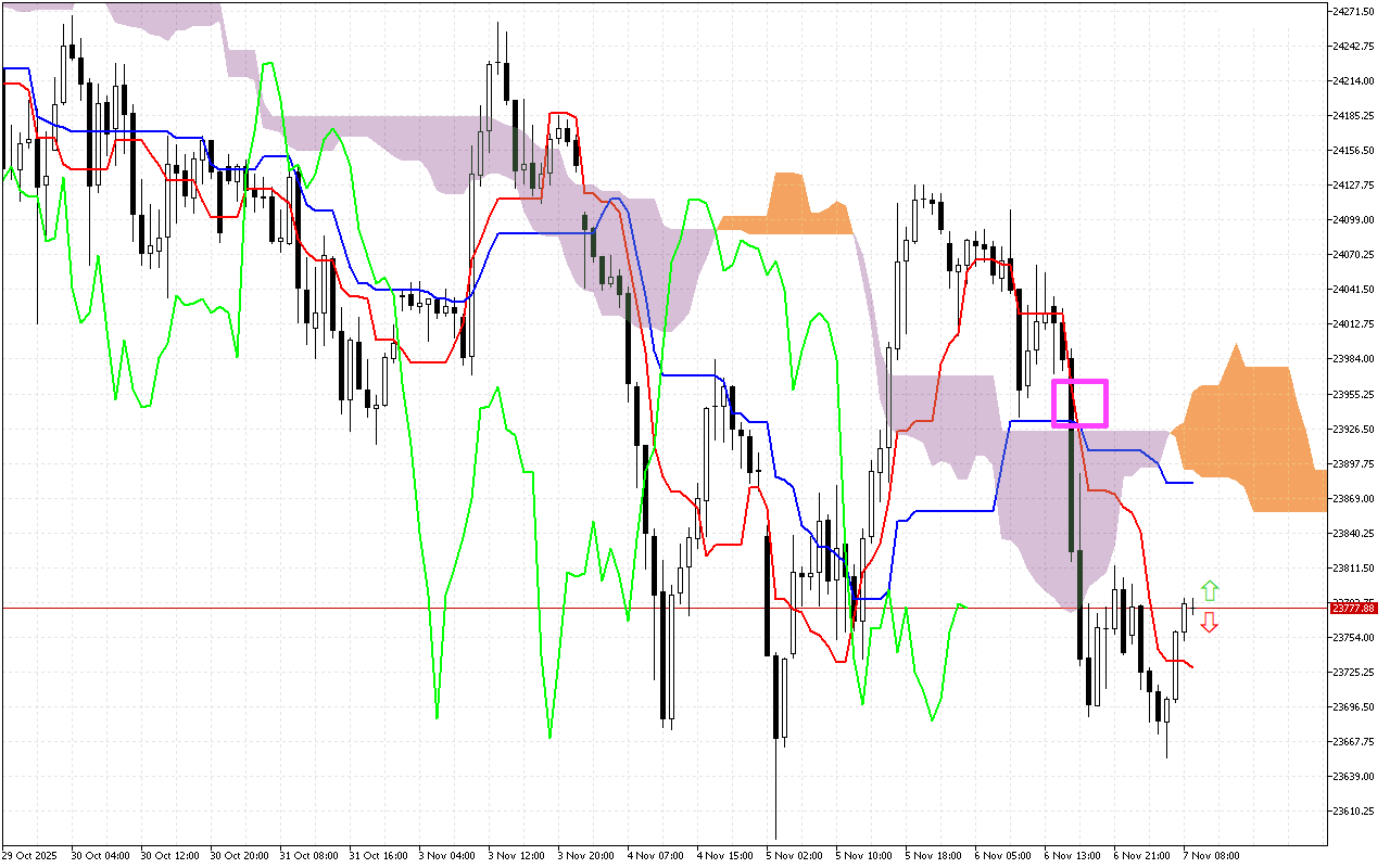 Usetshenziswa ngabatshalizimali ukukhomba ushintsho kuthrendi, ulayini oluhlaza Chikou ubanjwe ngaphansi kwenani eshadini.