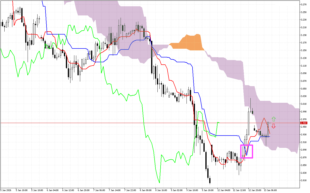 Enye yezimpawu ezibaluleke kakhulu kusibonisi se-Ichimoku ukuphambana kwemigqa ye-Tenkan kanye ne-Kijun. Eshadini lamanje elithi USDCHF, le signali imakwe ngesikwele esiphinki. Intuthuko eyalandela iholele ekwehleni kwentengo yolayini we-Tenkan. Umfutho okhuphukayo, owawuphakanyiswe ekuqaleni njengendawo yomgwaqo, awuzange ubonakale. Kunalokho, intengo yabonisa ubuthakathaka futhi ayikwazanga ukugcina izikhundla zayo.