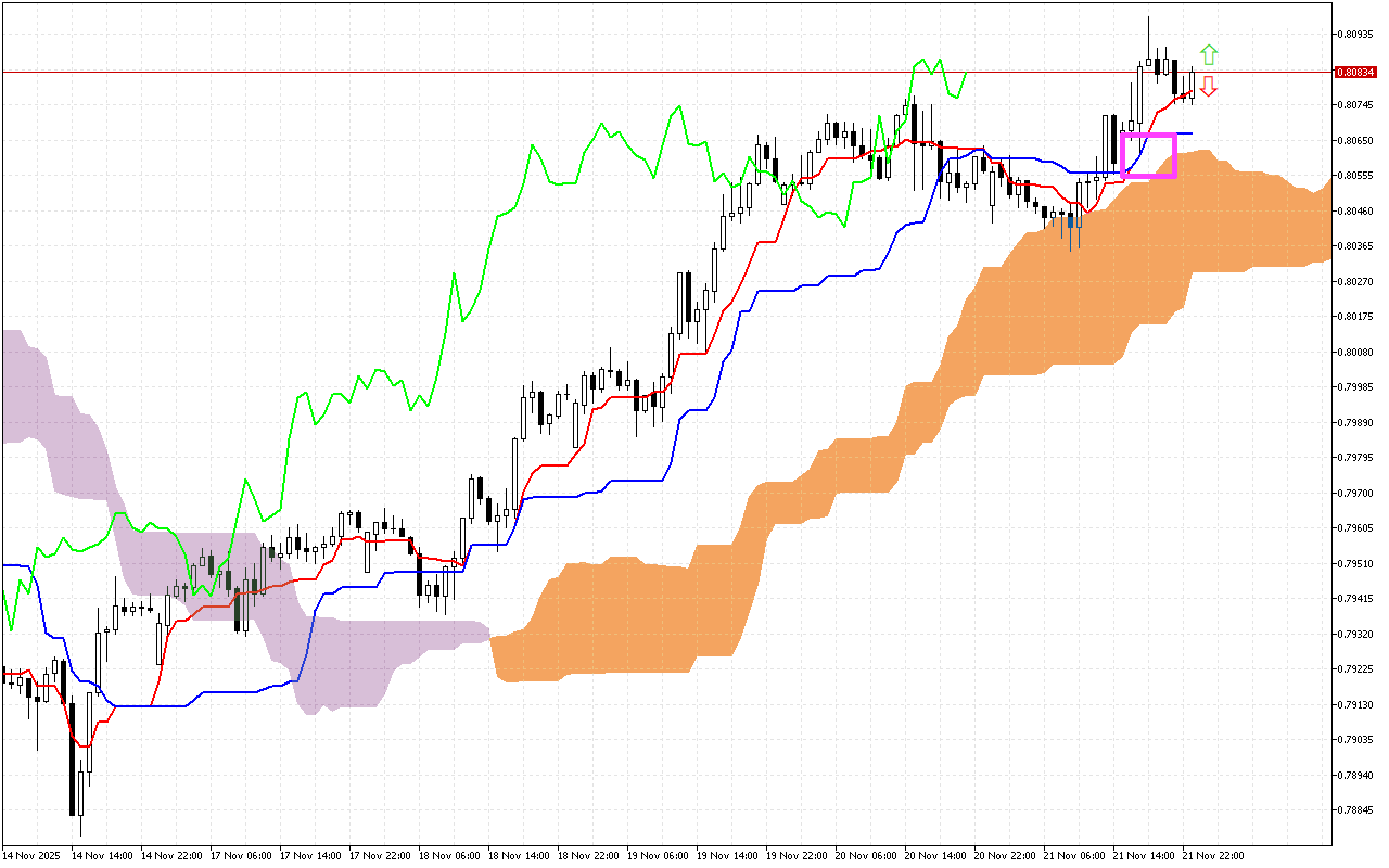 Amazinga okusekela ashukumisayo abonakala ku-Tenkan line eduze kuka-0.80294, i-Kijun line eduze kuka-0.80177, i-SenkouA line eduze kuka-0.80045, kanye ne-SenkouB line eduze kuka-0.80211.