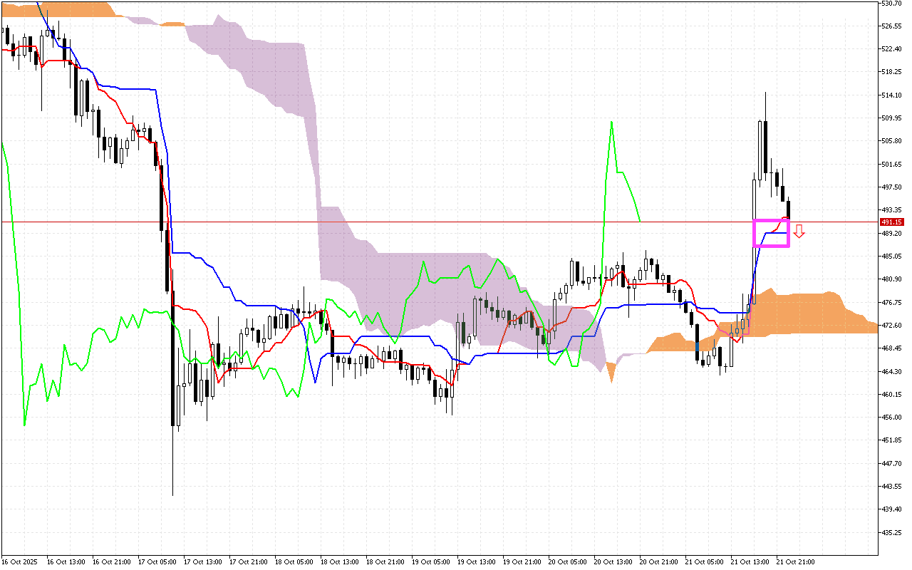 Enye yezimpawu eziyinhloko zezikhathi zokuhweba zangaphambilini kwaba ukuphambana kwemigqa ye-Tenkan kanye ne-Kijun. Le ndawo imakwe ngesikwele esiphinki egrafu. Ukukhuphuka komugqa we-Tenkan ngaphezu komugqa we-Kijun kuyisignali evumayo, engabonisa ushintsho olungenzeka kuthrendi ukuya phezulu.