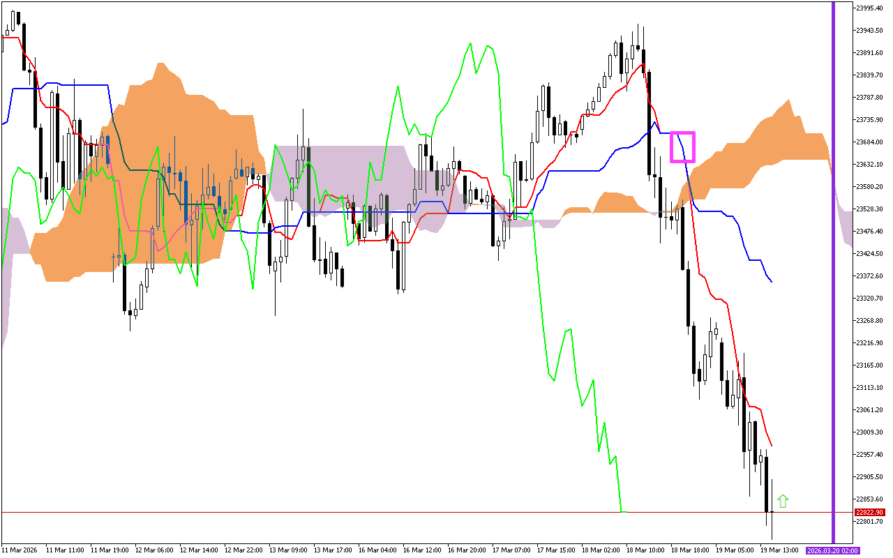 Ukuhlaziya izikhathi zokuhweba zangaphambilini, kufanelekile ukunaka impambana yolayini Tenkan kanye ne-Kijun, emakwe ngesikwele esipinki. Ulayini osheshayo we-Tenkan wehle ngaphansi kolayini we-Kijun, ovame ukuphawula ushintsho lwethrendi ukuya kweyokwehlayo. Nokho, ngokuhamba kwesikhathi intengo yenyuka ngaphezu komugqa we-Tenkan, okubonisa ubuthakathaka bomfutho ophansi.